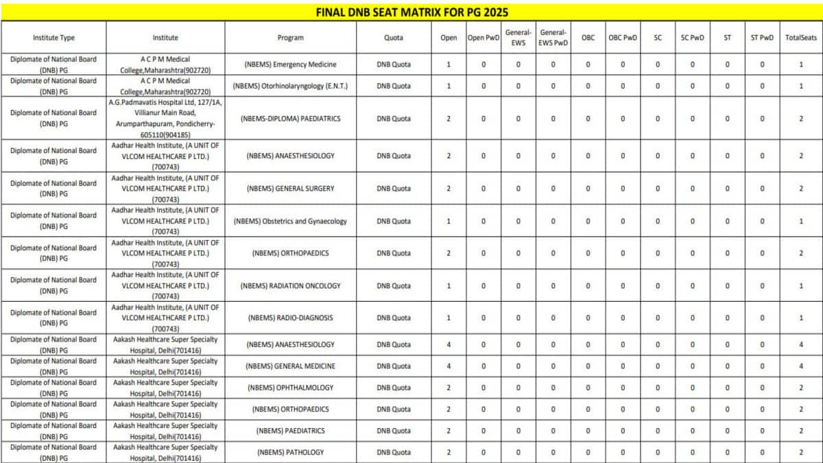 Here is the list of NEET PG 2025 seat matrix for DNB seats.