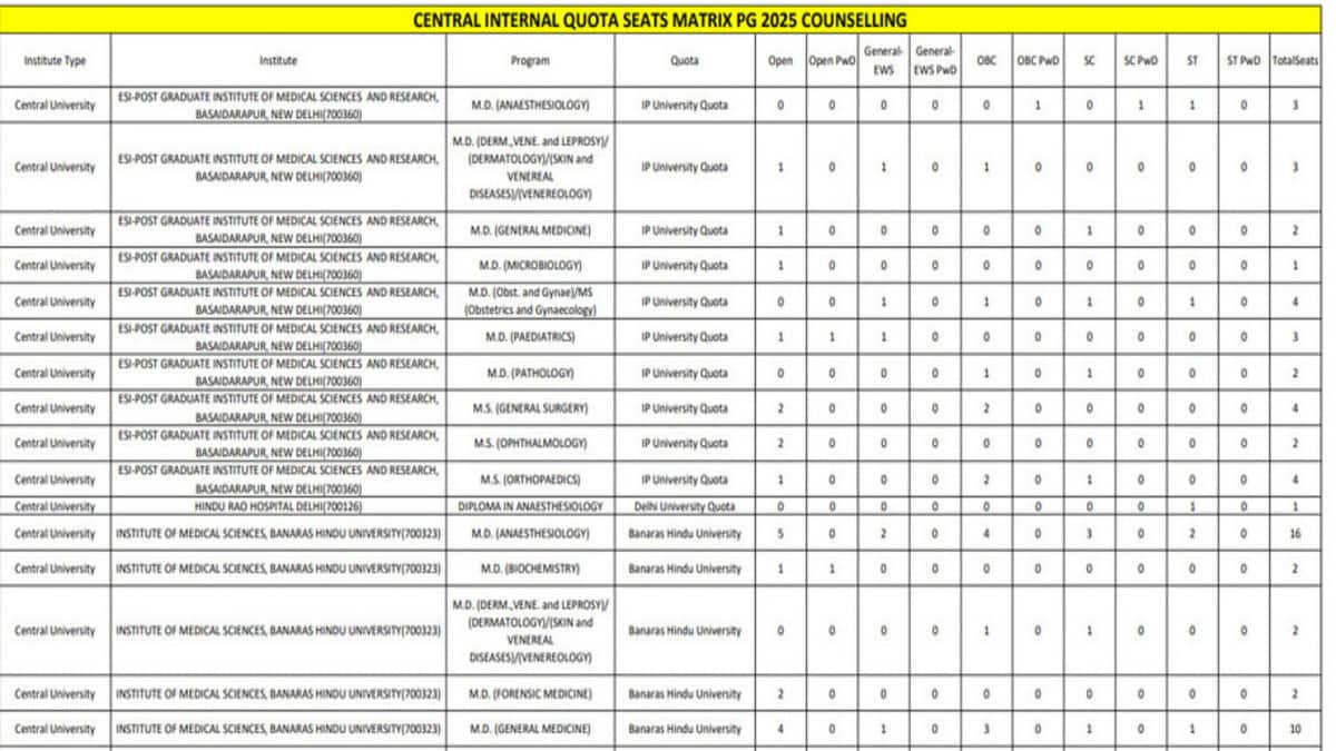 The Medical Counselling Committee (MCC) has released the All India seat matrix for admission to MD, MS and other post graduate at various central universities.
