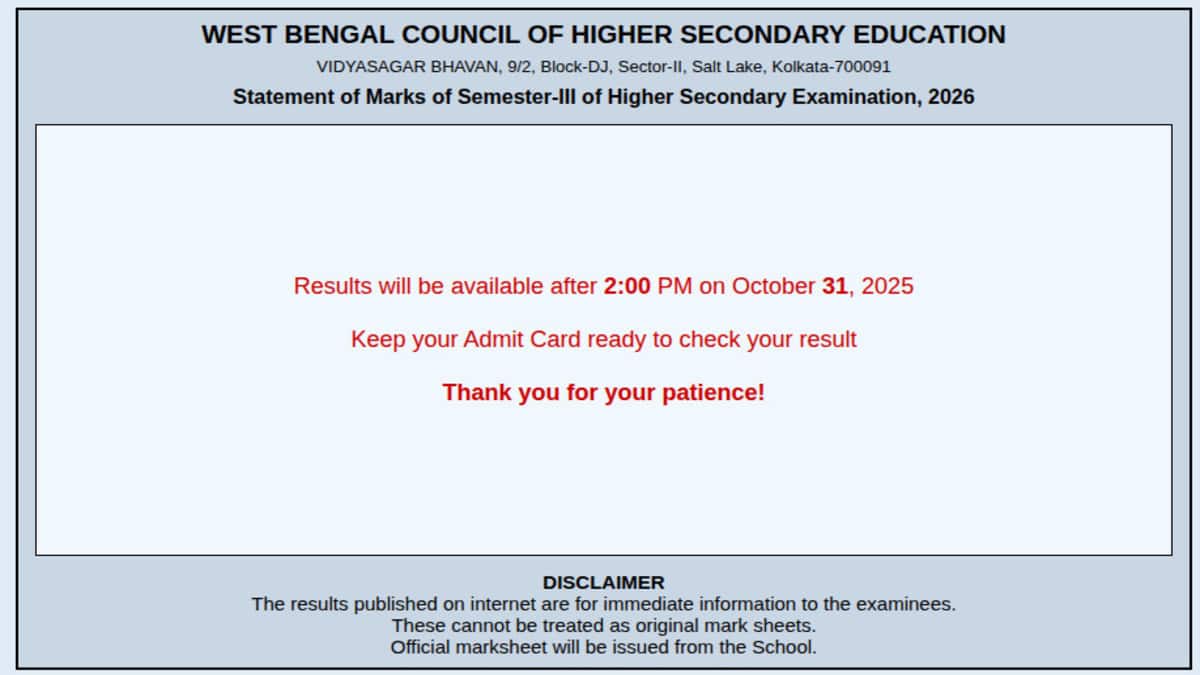 The WBCHSE will announce the WB Uchha Madhyamik 3rd semester result 2025 today after 2 pm, according to the official website.